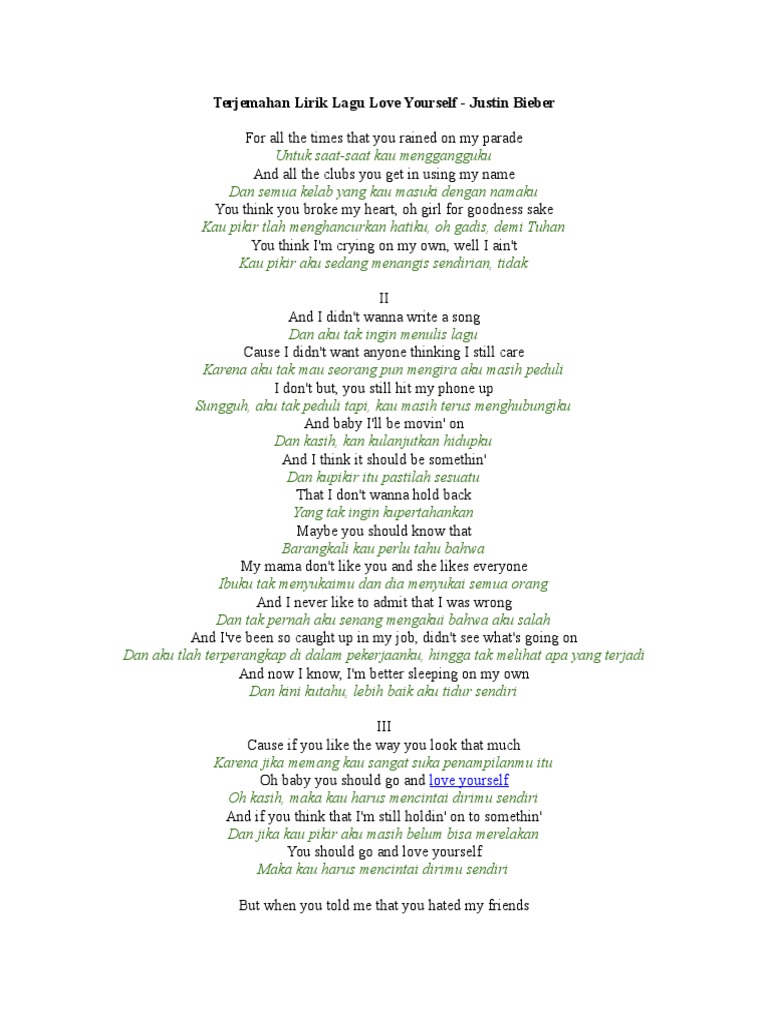 Berikut merupakan terjemahan dan arti dari lirik lagu Love Yourself milik Justin Bieber kedalam Bahasa Indonesia. But you still hit my phone up. Lirik lagu bahasa indonesia Song Title.